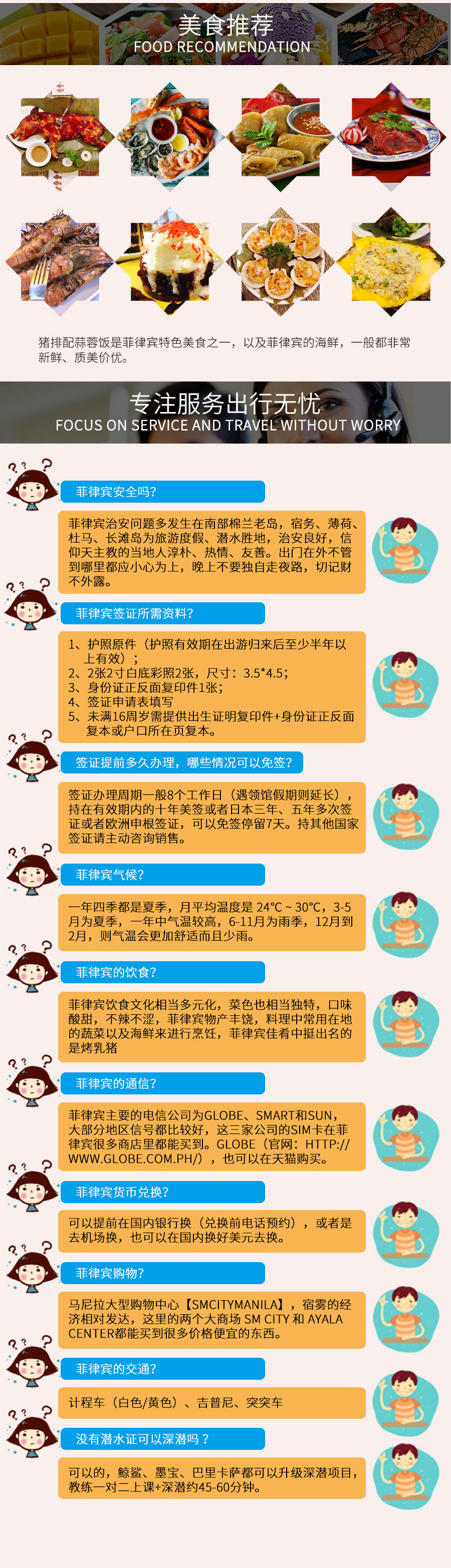 第5天 | 无 | 宿雾自由活动推荐400元梦幻岛出海或700元杜马盖地与鲸鲨共舞 全天自由活动,可参加自费A:400元/人梦幻岛出海:专车前往坦布里BEACH度假村,搭乘菲律宾本地特有的螃蟹船出海,沿途碧绿海水清澈可见五颜六色的海星,船夫会抓海星,供您拍照外;还会抓众多生鲜海胆,沾着哇沙米与酱油,让游客当场尝鲜,随后前往重要潜水点之一:【圣得瓦利鱼类保护区浮潜】,浮潜穿梭于壮丽珊瑚礁、海星间,与热带鱼(斑马鱼、尼莫鱼、七彩石斑等等)一同悠游于大海,提供面包享受喂鱼的乐趣,相信你一定惊叹于会有如此多的鱼群。船续航行约莫20分钟抵达并登上珊湖海中的—【梦幻岛】, 午餐:参加自费赠送岛上【B.B.Q烧烤海鲜餐与热带水果】,当地居民以卖海鲜为生,超级便宜,一桶桶各式不同活跳跳的海鲜,有石斑鱼、鲍鱼、东星斑、干贝及一些不知名的海鲜可自费挑选心仪的海鲜加工品尝,一大盆鲜贝仅50元人民币,七头鲍鱼10元人民币,只有本岛才有的超大个儿虾婆婆。。。。大快朵颐,在这里花钱是赚钱! 下午:参观梦幻岛,参观岛上原生态居民生活。 推荐自费B:杜马盖地与鲸鲨共舞+菲律宾特色餐 RMB700/人 乘车前往杜马盖地精华路线:oslob奥斯洛布岛与7米长温柔巨人鲸鲨共游浮潜 【与鲸鲨共舞】搭乘螃蟹船(4-10人一组)出海约40分钟,等待鲸鲨的出现,浮潜穿梭与巨鲨之间,如果运气好的话这次也许可以见到鲸鲨家族围绕着你。经历这场空前绝后的与鲸鲨共舞的节目之后,相信许多人在短时间之内,都难以平抚兴奋的情绪!(请遵守当地规定,禁止拍照、禁止手摸鲨鱼、禁止喂食等注意事项)推荐美食菲律宾特色烤乳猪特色餐+芒果冰沙。之后可自行去SM当地最大购物广场,自由SHOPPING,当地手工艺品等等。。 晚餐:请自理 | 宿雾 | ||||||