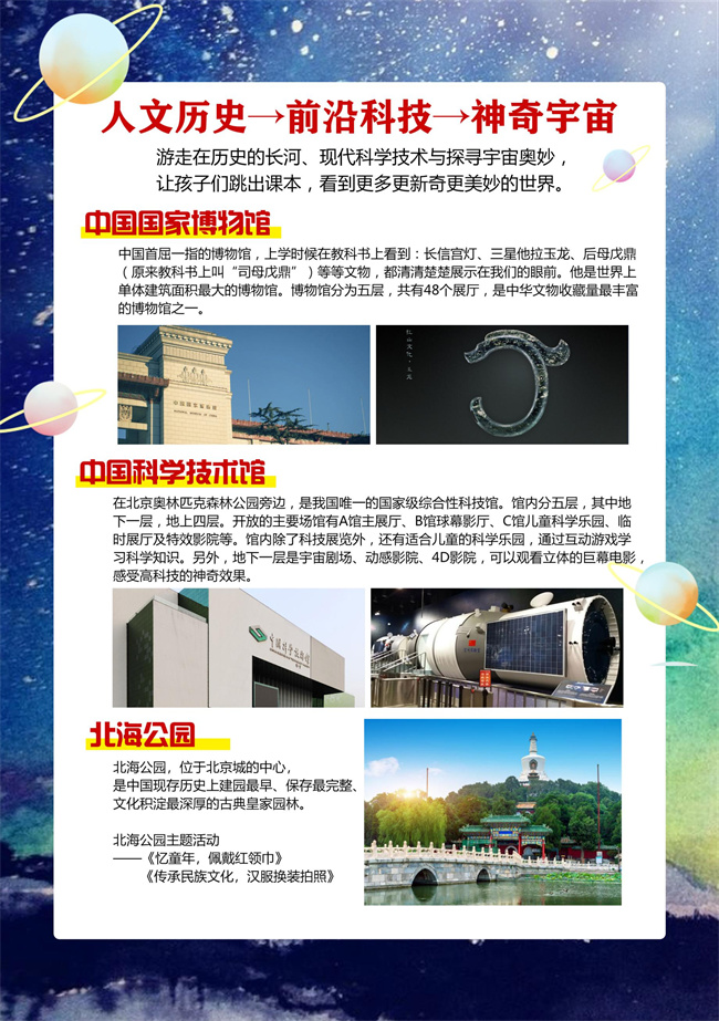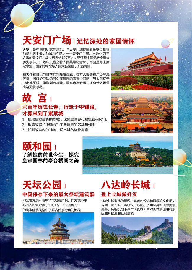 【门票】行程中所列景点门票;(故宫、天坛通票、八达岭长城、颐和园、科技馆、北海精品游、清华或北大参观,以实际出票为准)