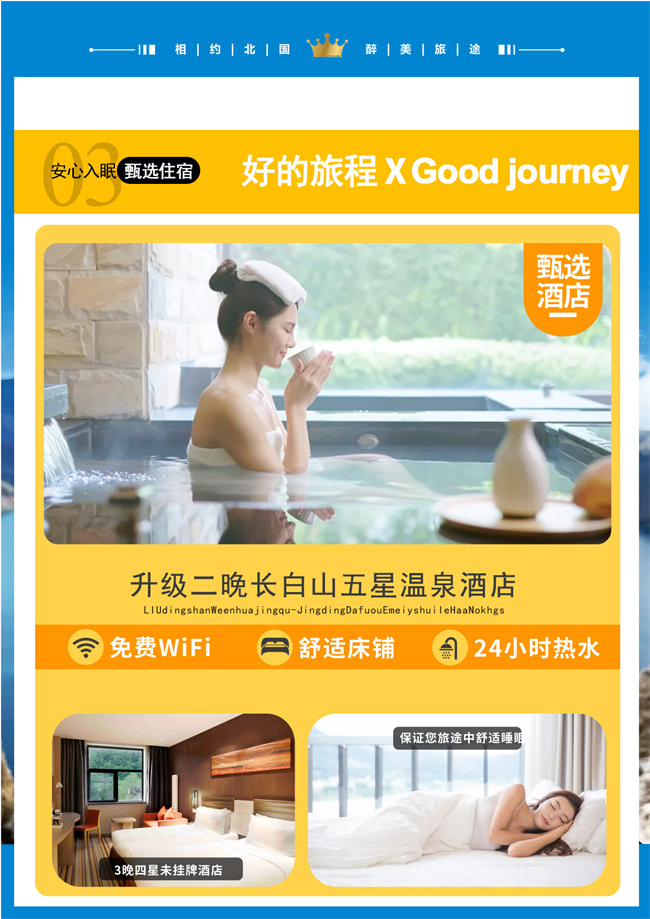 能够早起的小伙伴们,前往打卡【美食博主乌啦啦打卡地-水上市场】 这里就是当地人经常逛的市场,卖很多当地特色食材,小伙伴们可以在这里品尝手工制作的打糕、米肠、各种各样的泡菜、秘制牛板筋等;[小贴士]:如果您想赖床的话,酒店休息。 美好的一天,从一顿丰富的早餐开始。 【延边博物馆】前往延边州博物馆(游览时间约40分钟,周一闭馆,如遇闭馆,此景点替换成【金达莱广场】)延边博物馆始建于1960年,是一座集地方历史和朝鲜民族特色于一体的综合性博物馆。博物馆区域划分科学合理、功能完善,有藏品保管区、展览区、科研区、办公区几大功能区域。馆藏文物主要是以古代文物、近现代文物和朝鲜民俗文物组成。其中有唐代渤海贞孝公主墓墓碑和壁画(临摹本)、室相纹铜镜、双系釉陶罐等。 乘车前往长白山脚下二道白河镇, 抵达后游览【长白山美人松公园】(赠送,不去不退)内有美人松千余株,百年以上的古松352 株。习习清风鸟鸣,片片山花烂漫,漫步园内可以仰视美人松的洒脱风采。美人松,学名长白松。生长于长白山二道白河,因形若美女而得名,是长白山独有的美丽的自然景观,被誉为长白山“奇松”。有全长 346 米的【空中画廊】(赠送,不去不退)观景台、站在【玻璃栈道】(赠送,不去不退)观景台上可以尽听松涛远眺长白圣山,美丽的小镇尽收眼底,仿佛置身人间仙境。 晚餐后,体验【长白山温泉】(占床客人赠送温泉,不去不退,不可转让,泳衣自备)。长白山温泉有“神水”之称,属于高热温泉,多数泉水温度在摄氏60度以上,最高泉眼可达摄氏82度,把自己滑入温润的泉水中,氤氲的水汽掩着远处的茫茫长白山颠,倾世豪情融化了一腔豪情,自备泳衣放松一下吧~舒舒服服洗个温泉澡,长白山好梦!!第二天又是满状态。整洁、卫生的环境和细致、周到的服务可以让宾客在缓解疲劳之时享受尊贵。 备注:温泉为酒店赠送项目,如因酒店维护或特殊原因不能体验无费用可退。 | |||