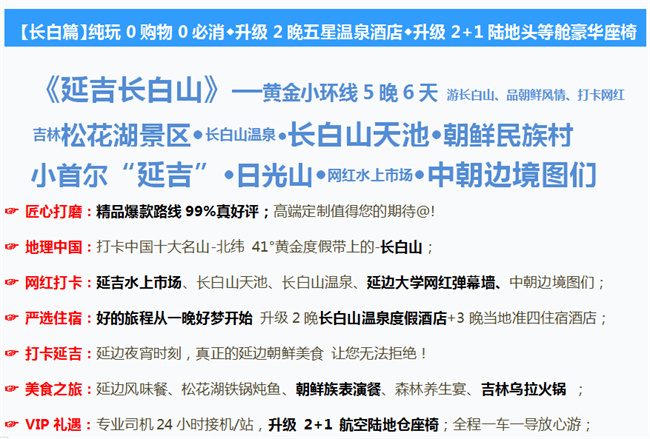 ※※(市区标间/大床,全程不提供自然单间,产生单房差需客人自理)※※ 住宿:全程酒店双标间, 准四星参考酒店 吉林市:雾凇宾馆、维也纳酒店、世纪酒店、利雅得酒店、喆啡酒店、大唐酒店或同级 延吉市:长白松宾馆、华阳酒店、韩元酒店、乾元翔宇、绿源酒店或同级。 长白山升级2晚温泉酒店:观景温泉、云水希悦、云水澜庭、金水鹤酒店、御麓泉酒店、长白山大厦、山水泉或同级。 用餐:全程含5早5正(酒店早餐不吃不退)全程特色餐不吃不退,人数减少,菜量调整。 用车:保证每人一个正座(不提供座次要求),行程内所有自由活动期间及行程外均不含用车。 3-5月份团期满20人以上升级2+1豪华座椅,(人数低于20人含20人改成普通旅游车型)全程用车每人含一个正座(婴儿也含座)。旺季7-8月份团期为普通旅游车型。 门票:包含景点首道大门票门票:长白山大门票+松花湖景区大门+松花湖景区环线车 赠送景点:延边大学网红打卡、美人松公园、长白山温泉、长白山朝鲜民族村、日光山、水上市场、北山公园(赠送景点不去不退,如遇政策性关闭,不退费) 导服:持证导游陪同,全程8人以下无导游服务 司机兼向导(不进景区)。 保险:我社已承保旅行社责任险,意外险请根据情况自愿购买 儿童:儿童价:1.2m 以下,只含当地车位、导服、半价正餐,不占床,不含早餐,其他费用产生自理。不占床不含早餐。(超高儿童补景区大门票130元人) 大交通:合肥-长春往返机票含税 赠送项目,如因时间、天气或是政策原因我社有权利取消该项目,赠送项目不去不退,不做等价兑换! 体验项目+赠送项目不作为团费包含项目,客人不参加无费用可退,不参加视为自动放弃! 根据当地情况,会调整景区游览以及住宿先后顺序,但保证所有行程全部游览完毕。 | |||