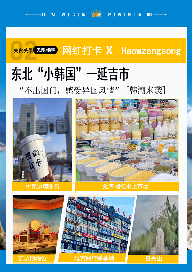 早餐后,乘车赴延边自治州--中朝边境图们市(车程约 4.5 小时),这里紧靠图们江,雄伟壮丽的国门高高矗立在中朝国境桥头。图们市是吉、黑两省通往朝鲜北部的重要门户。 游览【日光山景区】(赠送景点)景区栈道登上【日光亭】,看对面朝鲜南阳市景观,【中朝铁路桥】、公路桥,下山打卡 【中朝86号界碑】 打卡【网红弹幕墙】这是一座 8 层的楼,每层的广告牌都印有韩文,仿佛置身于韩国,留下倩影刷爆朋友圈。 【延边大学】(外观)地处有“教育之乡”美誉的吉林省延边朝鲜自治州首府延吉市,是国家“211 工程”的重点建设大学。 东北“小首尔”--延吉市,延吉市是延边朝鲜族自治州首府城市,全中国最大的朝鲜族集聚地,有小首尔之 美誉,让您不出国门便可体会异国风情,办理入住后让我们远离大城市的喧嚣,一边体验这座小城带给您的宁静,一边 品尝着朝鲜族美食。(冷面、打糕、米肠、拌饭、烤肉) 晚餐自理, <延吉美食推荐> 1.延边大学附近美食:小木屋米酒店——芝士玉米和辣爆鸡爪是每次必点,米酒是他家的特色也 是肯定要点的;冷面推荐——服务楼冷面或者顺姬冷面都是不错的选择,吃上一口锅包肉再配上一口冷面那味道简直是绝了;全州拌饭——烤猪肉拌饭、石锅拌饭、大酱汤统统都要安排上!全州拌饭生意很好,去的时候要做好排号的准备。 2.旌善章鱼城 :特色就是生吃活章鱼!除了生吃以外其他的吃法也很多,比如:水煮章鱼、章鱼铁板、章鱼炒饭、章鱼 蒸饺等等。 【特别提示】:如参团低于10人乘坐高铁前往延吉。 | |||