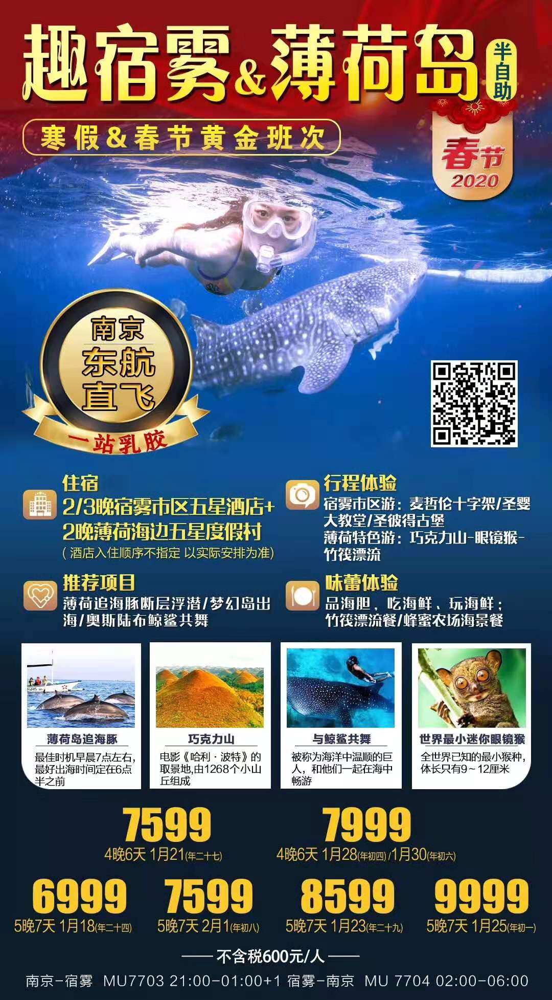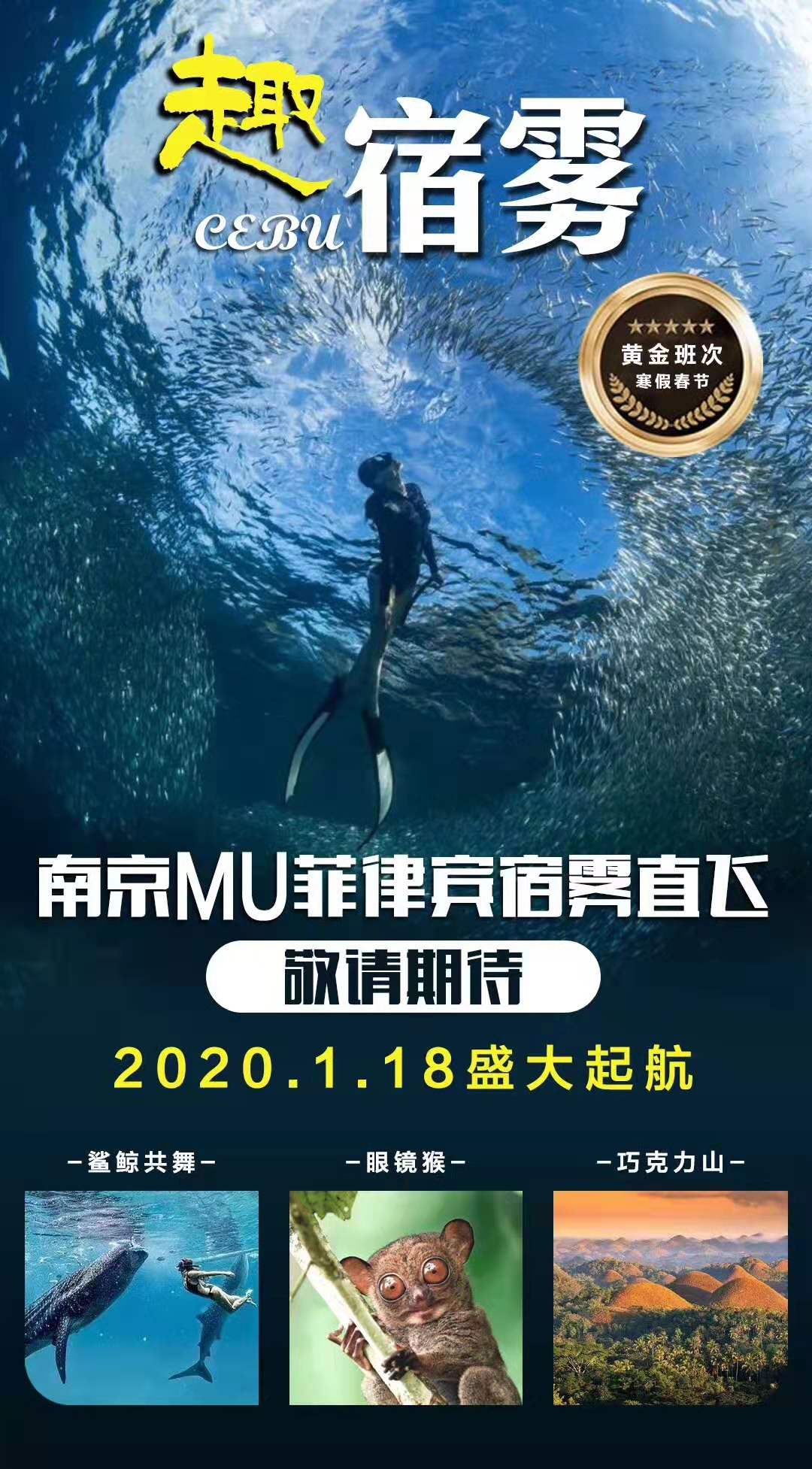 第1天 | 飞机 | 参考航班:南京-宿雾 参考航班:MU 7703 2100-0100+1 各位贵宾在南京禄口机场集合,搭机前往宿雾,后入住酒店休息。 温馨提醒:1.提醒各位贵宾在当天的24小时内不要参加任何潜水活动,高空和海底是2个极端,短时间内人体经历这2个过程,会导致一些突发疾病,体质弱的人会发生肺泡炸裂或者血液氮中毒。 2.请客人务必于航班起飞前3小时到达机场。 3.人民币与菲律宾比索的汇率是约为1:7,导游可以协助客人兑换。 4.该航班免费托运行李为20公斤。 | 宿雾当地五星 | ||||||