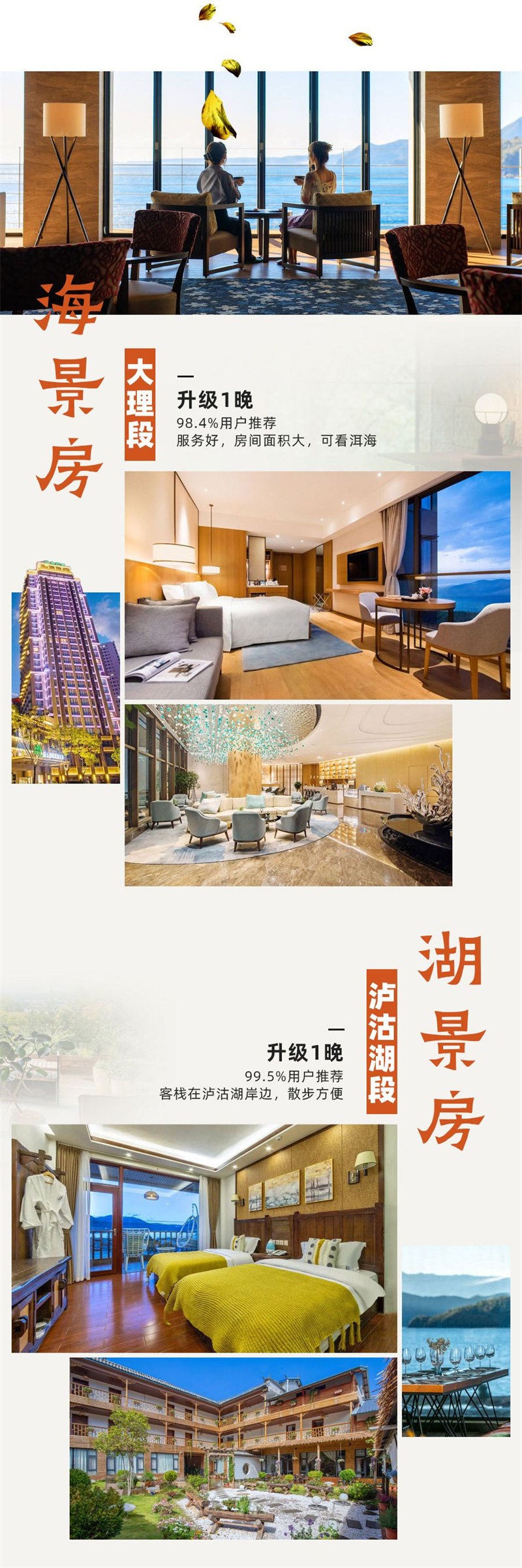 1、住宿: 丽江 3 晚携程 4 钻酒店/四星酒店; 大理安排 1 晚携程 4 钻酒店/四星酒店/备选酒店海景房; 泸沽湖安排湖景/备选酒店;